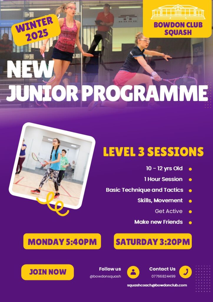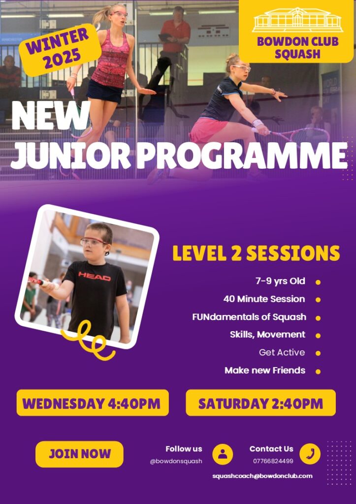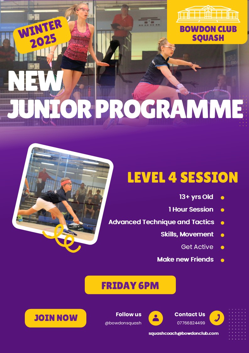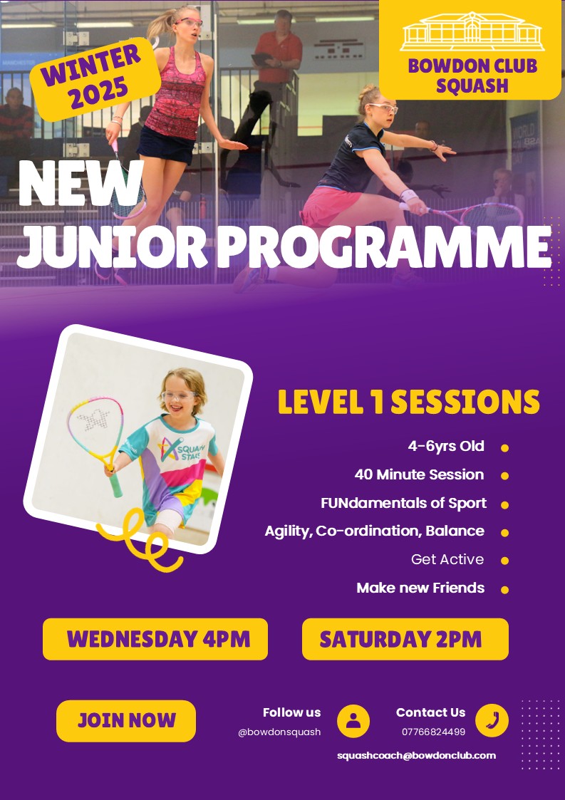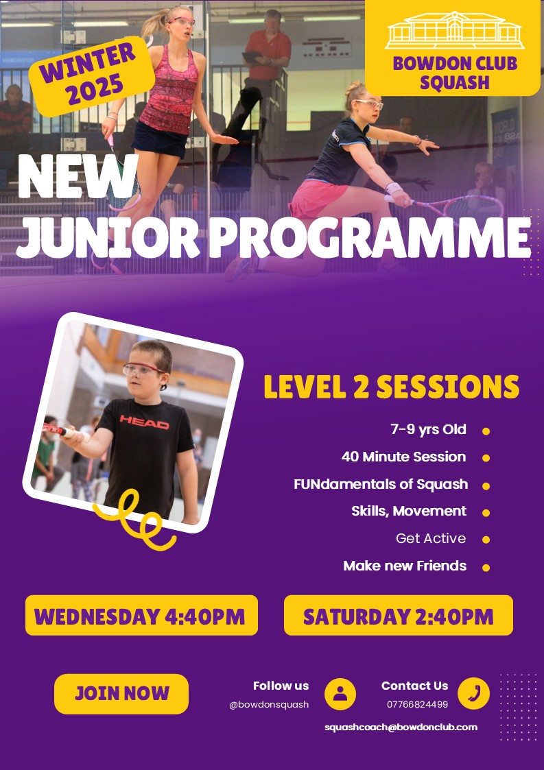 Bowdon Junior Squash is a thriving section of the club. Although junior members are welcome to play at any time, subject to the appropriate court booking fee being paid, there are various organised sessions and incentives to enable quality play and coaching for all junior players.